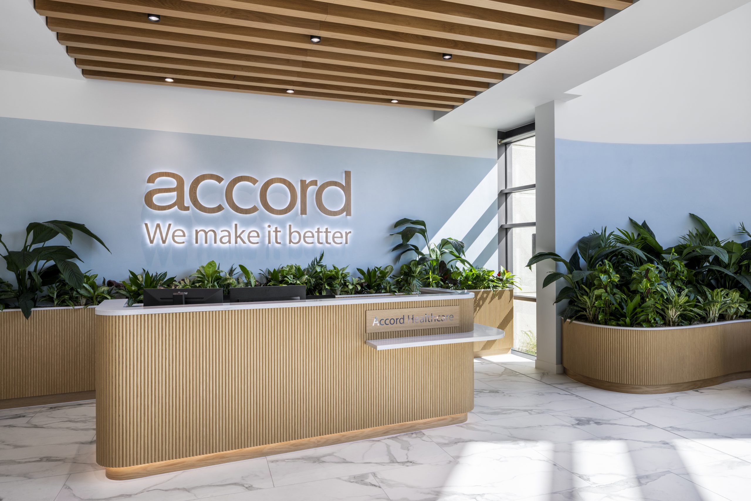 Accord Healthcare wanted a modern, collaborative workspace that would co-locate their research laboratory and office teams while incorporating cultural design principles and creating an environment that encourages connection and collaboration among their teams.