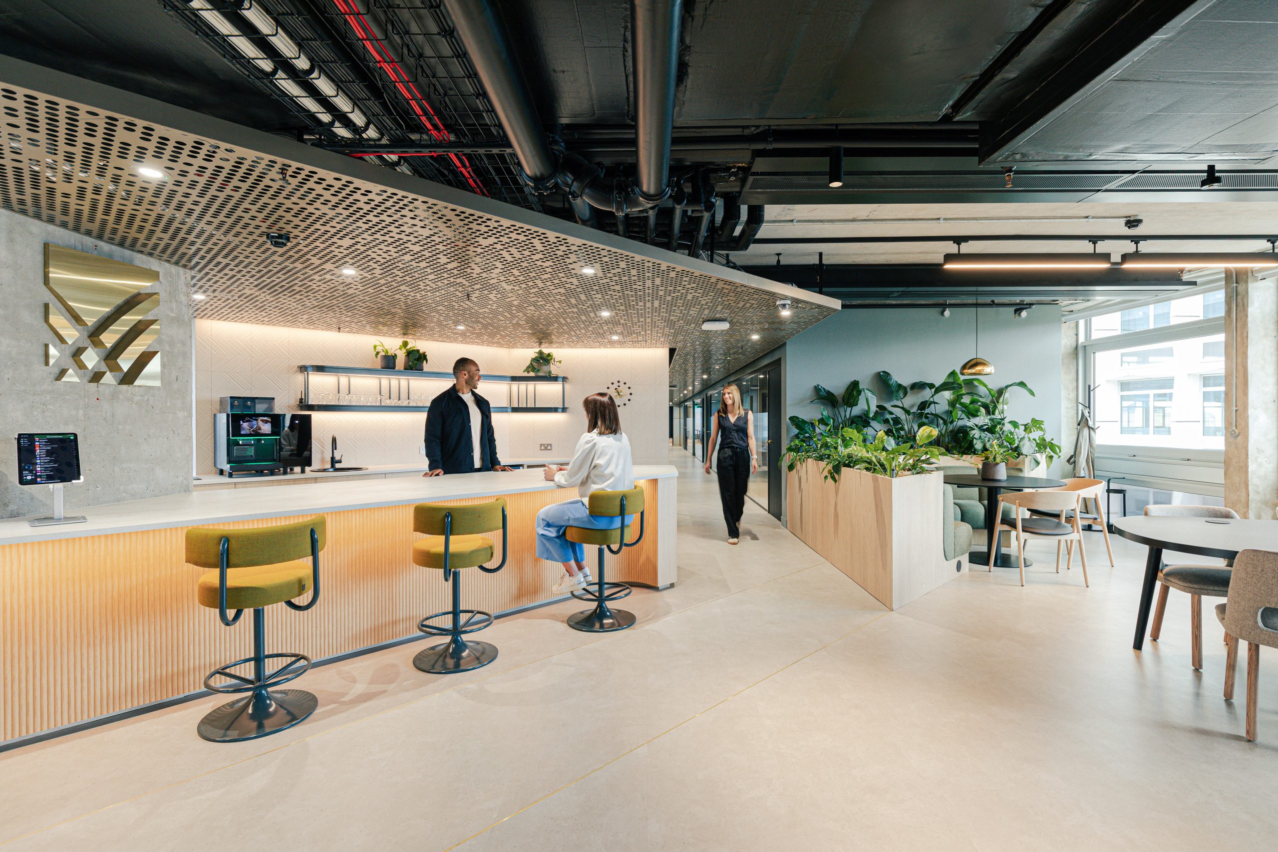 We delivered a full CAT B fit-out of Space House’s iconic tower in central London. Inspired by the brutalist architecture of the building itself, we embraced raw finishes like exposed concrete and bold geometries, softened with natural materials and layered textures. The layout champions inclusivity and wellbeing, offering a range of zones for collaboration, focus, social connection, and retreat.