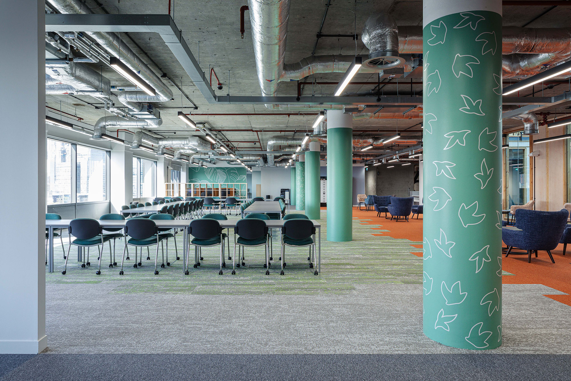 Aesthetically, we included a range of colours that mirrored the university’s other floor, but in more muted pastel hues. This was enhanced with innovative graphics on the walls, including wrapped columns, and an expansive use of greenery and plant life to give it a calm feel, supporting student wellbeing.